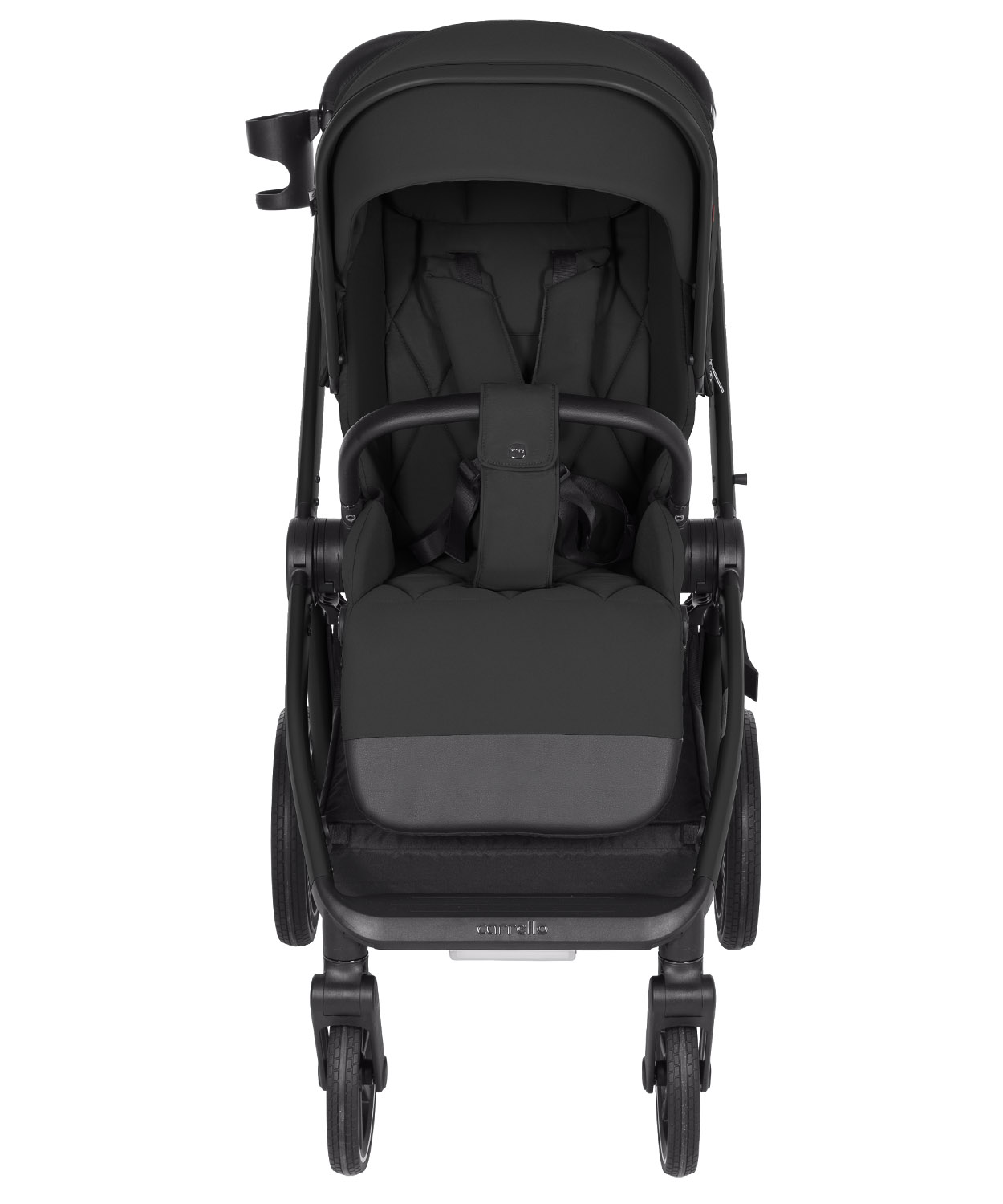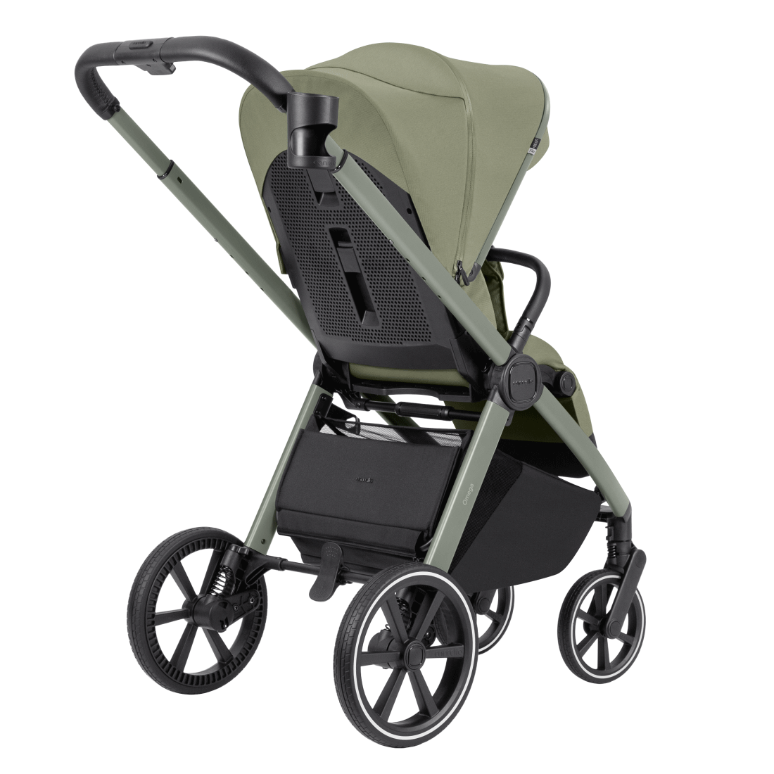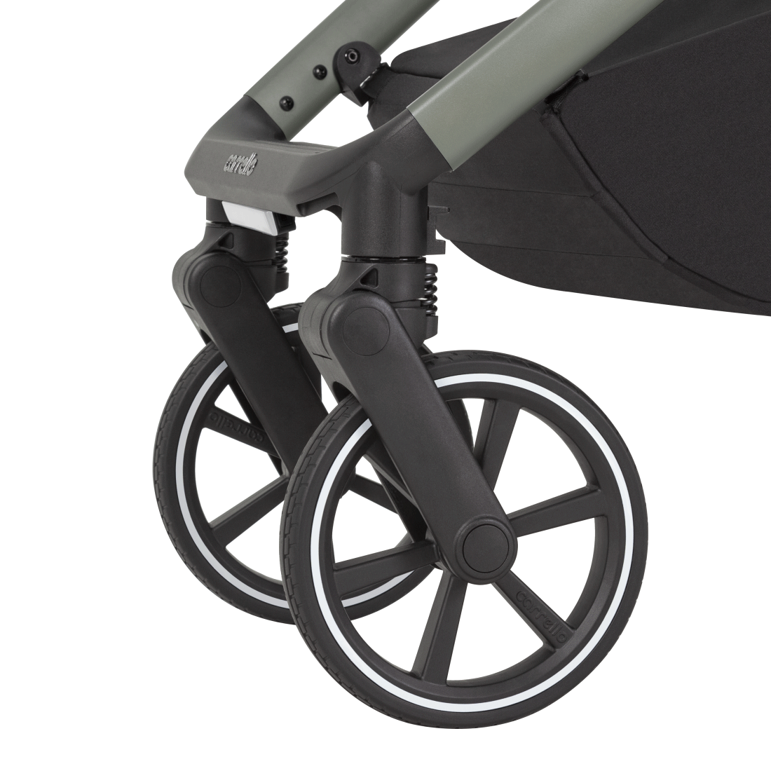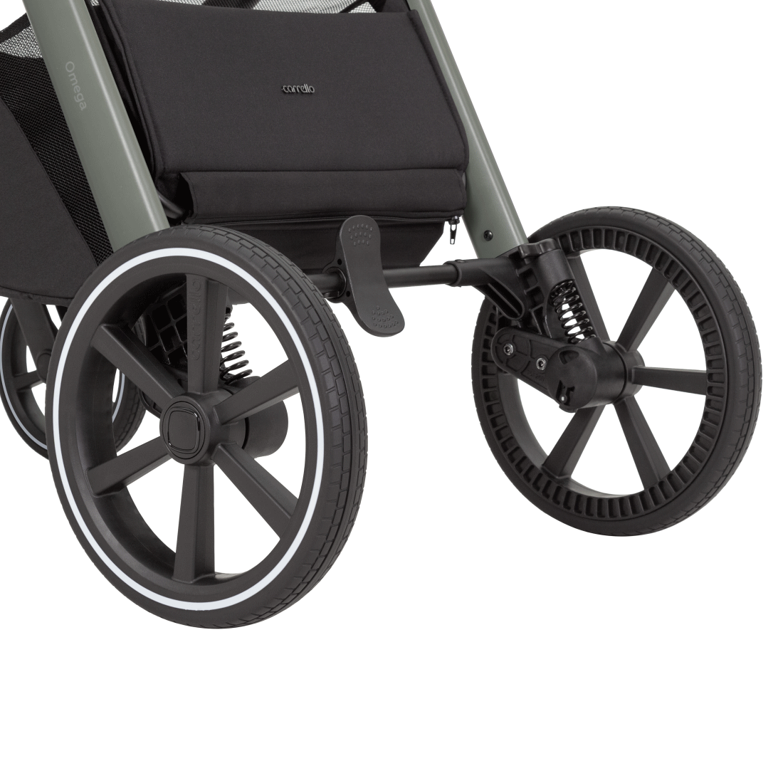 Die adaptive Dämpfung des Kinderwagens dämpft die Fahrt und absorbiert Vibrationen.