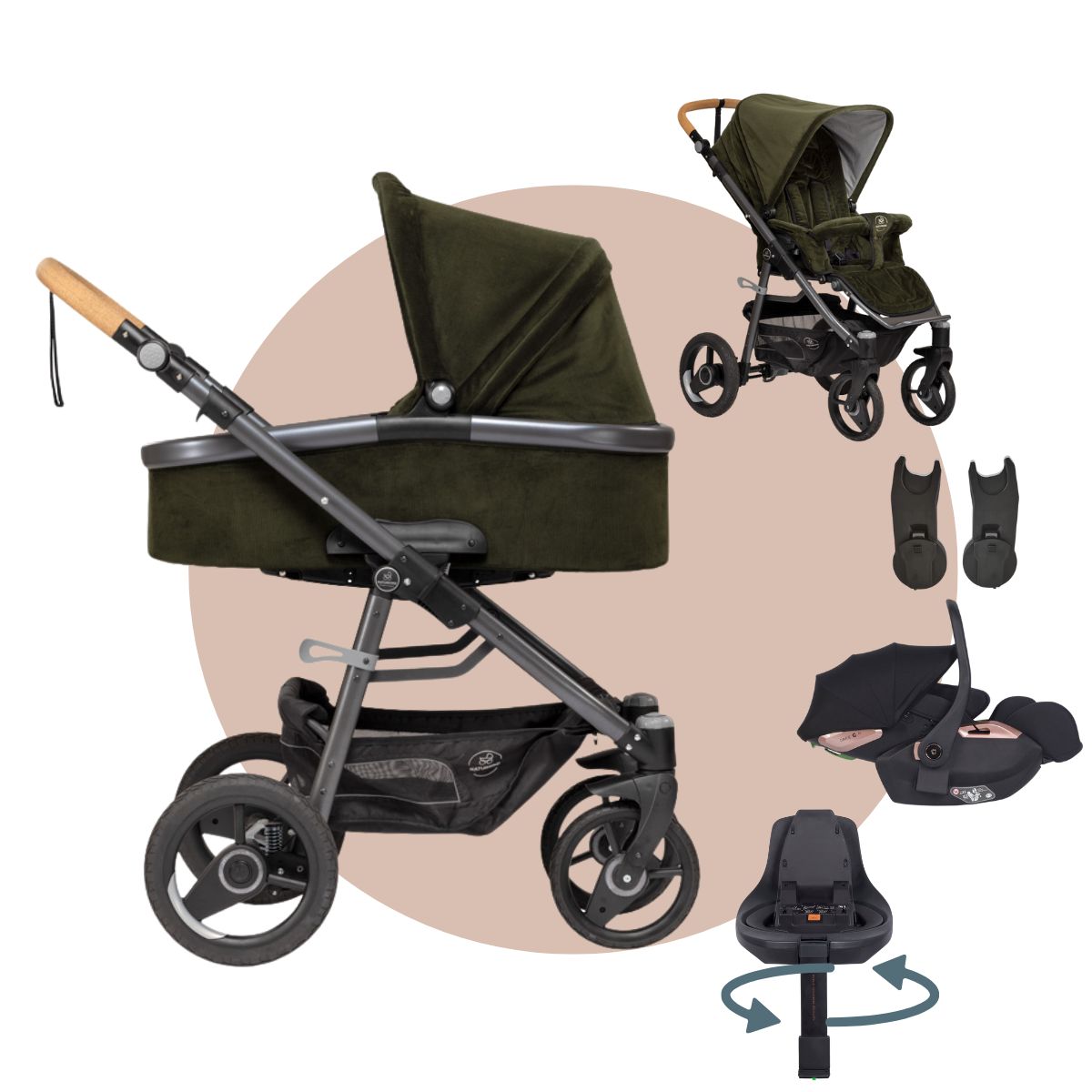 Naturkind Lux Evo | BIO Kinderwagen im MEGASET: mit Babykorb + Sportwagen + Autoschale + Isofix Station drehbar