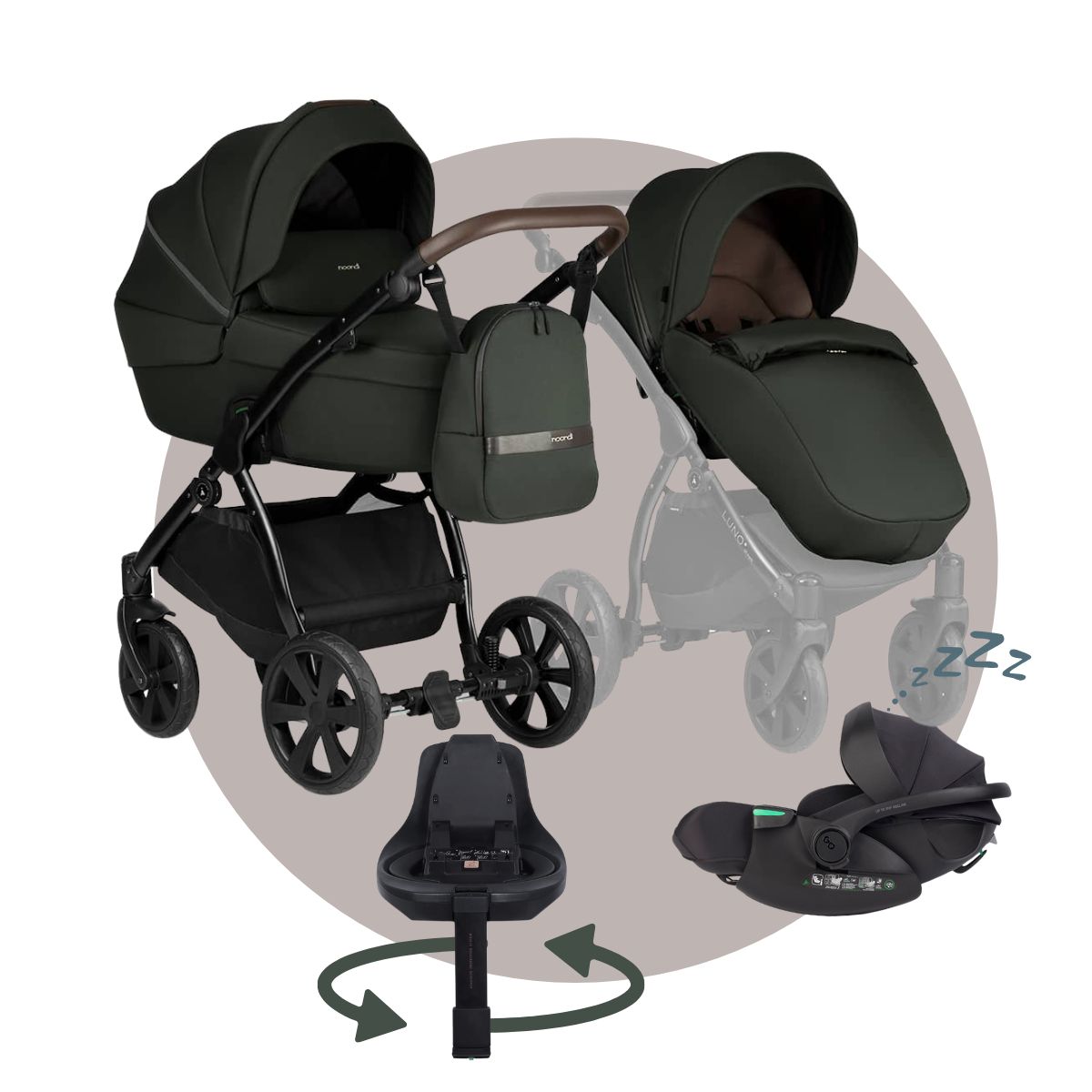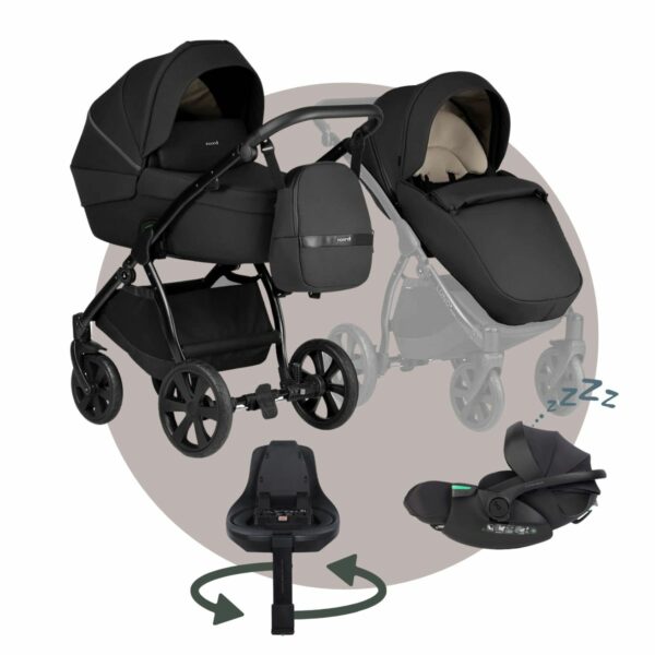Noordi LUNO | MEGASET: Kinderwagen mit Babywanne + Sportwagen + Autoschale + Isofix drehbar